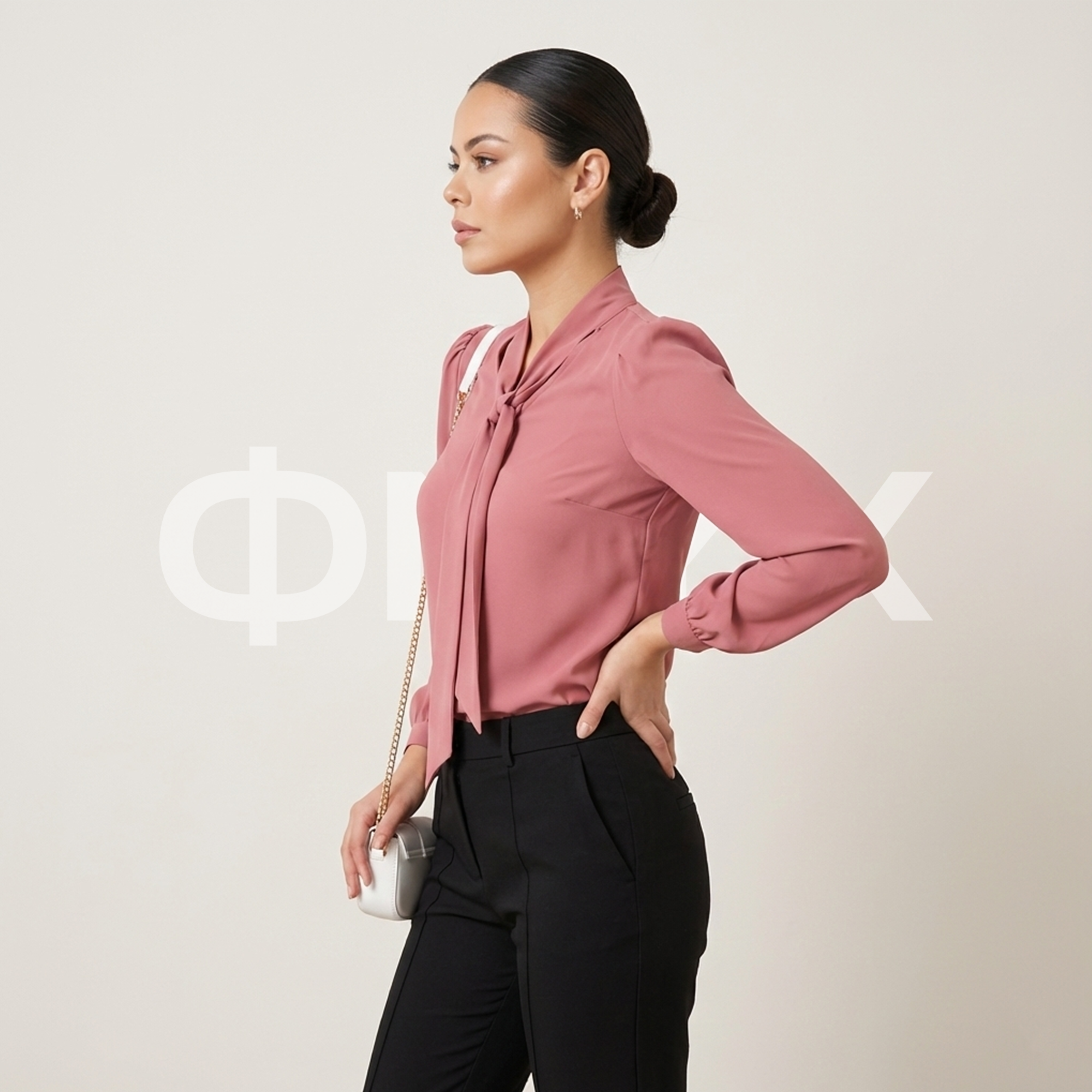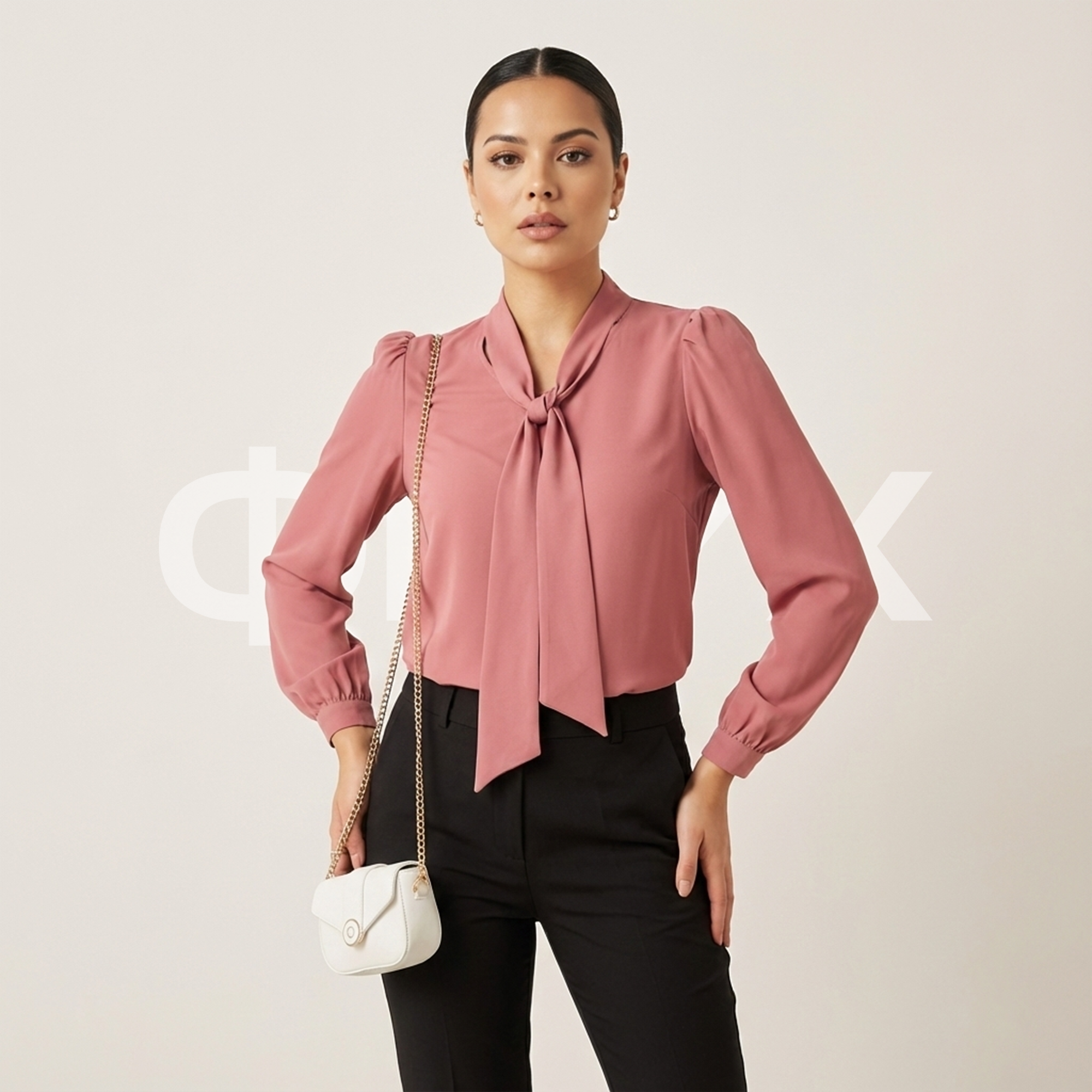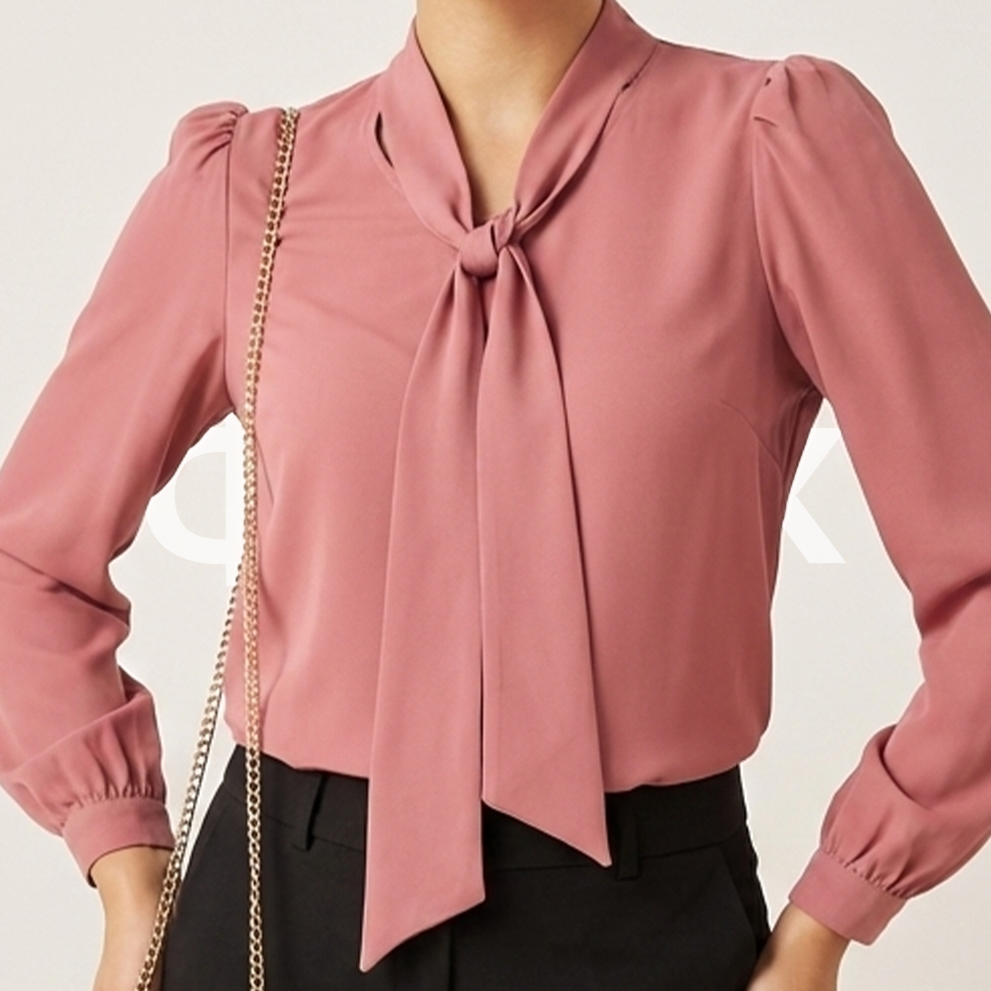 Der Schalkragen (Bindekragen) fällt sanft nach vorn und kann locker getragen oder für eine strukturiertere Silhouette gebunden werden. Dezente Raffungen an den Ärmeln verleihen den Schultern sanftes Volumen und unterstreichen die elegante Form der Bluse, ohne sie schwer oder einengend wirken zu lassen.