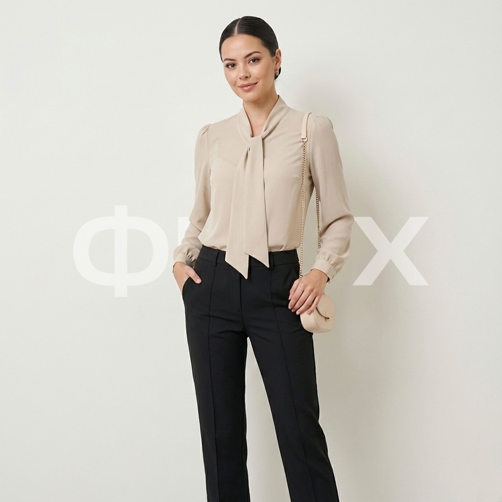 ФNYX Damenbluse mit gerafften Ärmeln und Schalkragen – Langarm (Beige)